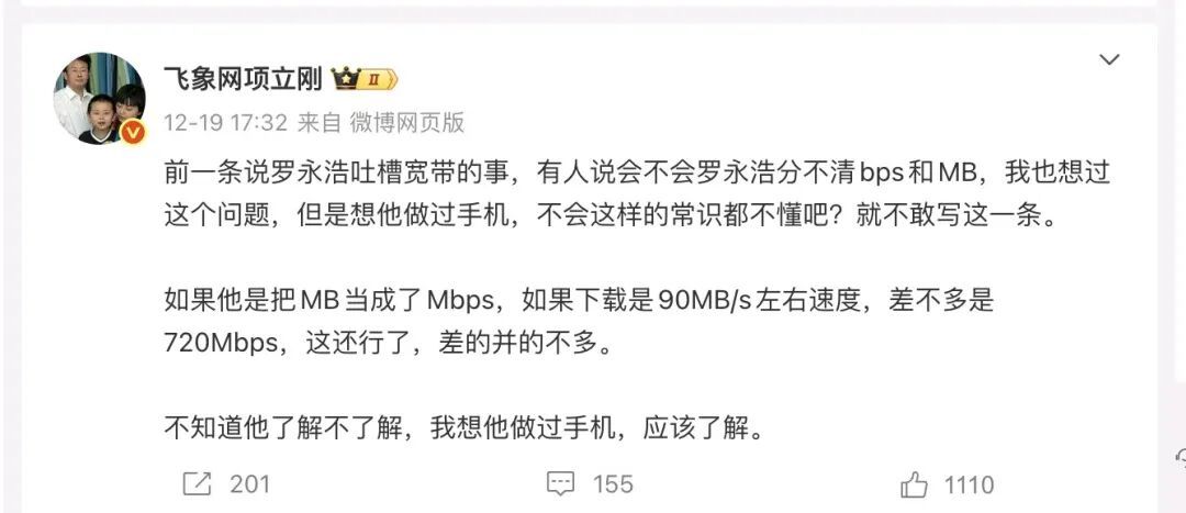 ▲项立刚评论罗永浩吐槽宽带缩水事件后,遭其回怼。
